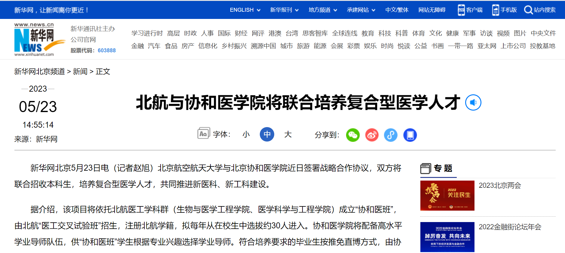 05 24  新华社客户端:北航与协和医学院将联合培养复合型医学人才 新华社客户端:北航与协和医学院将联合培养复合型医学人才新华社客户端2023年5月23日(记者 赵旭)报道:北航与协和医学院将联合培养复合型医学人才新华网北京5月23日电(记者 赵旭)北京亚洲成人在线一二三四五六区与北京协和医学院近日签署战略合作协议,双方将联合招收本科生,培养复合型医学人才,共同推进新医科、新工科建设。据介绍,该项目将依托北航医工学科群(生物与医学工程学院、医学科学与工程学院)成立“协和医班”,由北航“医工交叉试验班”招生,注册北航学籍,拟每年从在校生中选...