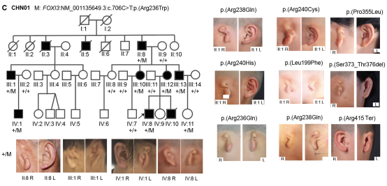 本研究针对中国、巴基斯坦、欧洲的半侧颜面短小畸形家系,采用高通量测序方法鉴定出FOXI3为致病基因。最终在670位无亲缘关系的患者中发现21位携带FOXI3基因突变,对疾病贡献度约3.13%。为解释复杂的遗传模式,通过单体型分析揭示了FOXI3突变位点协同反式单倍型调节患者表型的严重程度。随后,本研究通过体内外研究确证了FOXI3为半侧颜面短小畸形的致病基因。体外实验发现突变会降低FOXI3转录活性,体内实验发现Foxi3突变小鼠表现为颌面部发育异常,很好地重现了该疾病的临床表型。