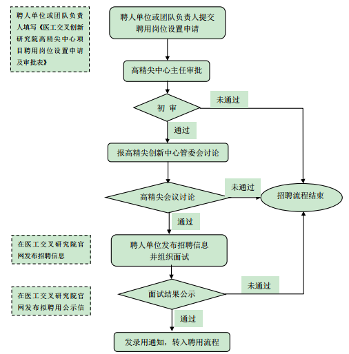 1. 聘人单位或团队负责人填写《医工交叉创新研究院高精尖中心项目聘用岗位设置申请及审批表》,经高精尖中心主任审批通过后,报高精尖创新中心管委会讨论并备案。