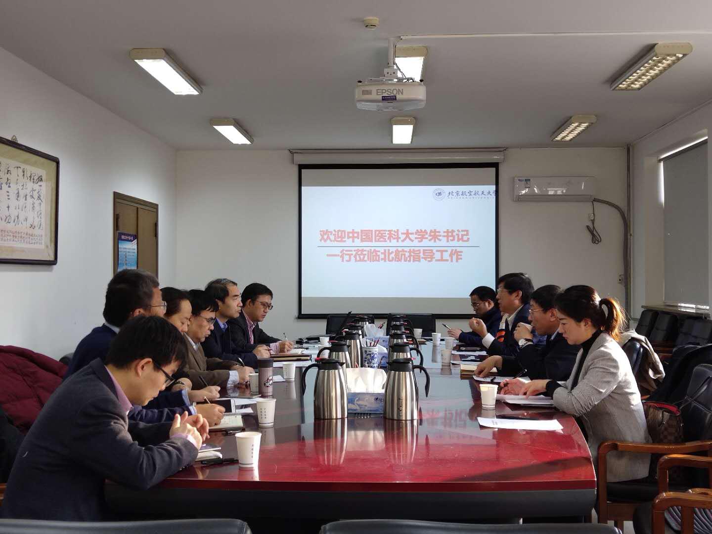 双方就两校之间的学科优势,教学科研特色,今后学校的发展布局展开充分交流。中国医科大学朱京海书记对我校医工交叉方面取得的成果表示赞赏,希望未来与北航能够在航空医学、医疗、培训方面开展更长远的合作,推动航空医学领域的发展,更好为大众服务。