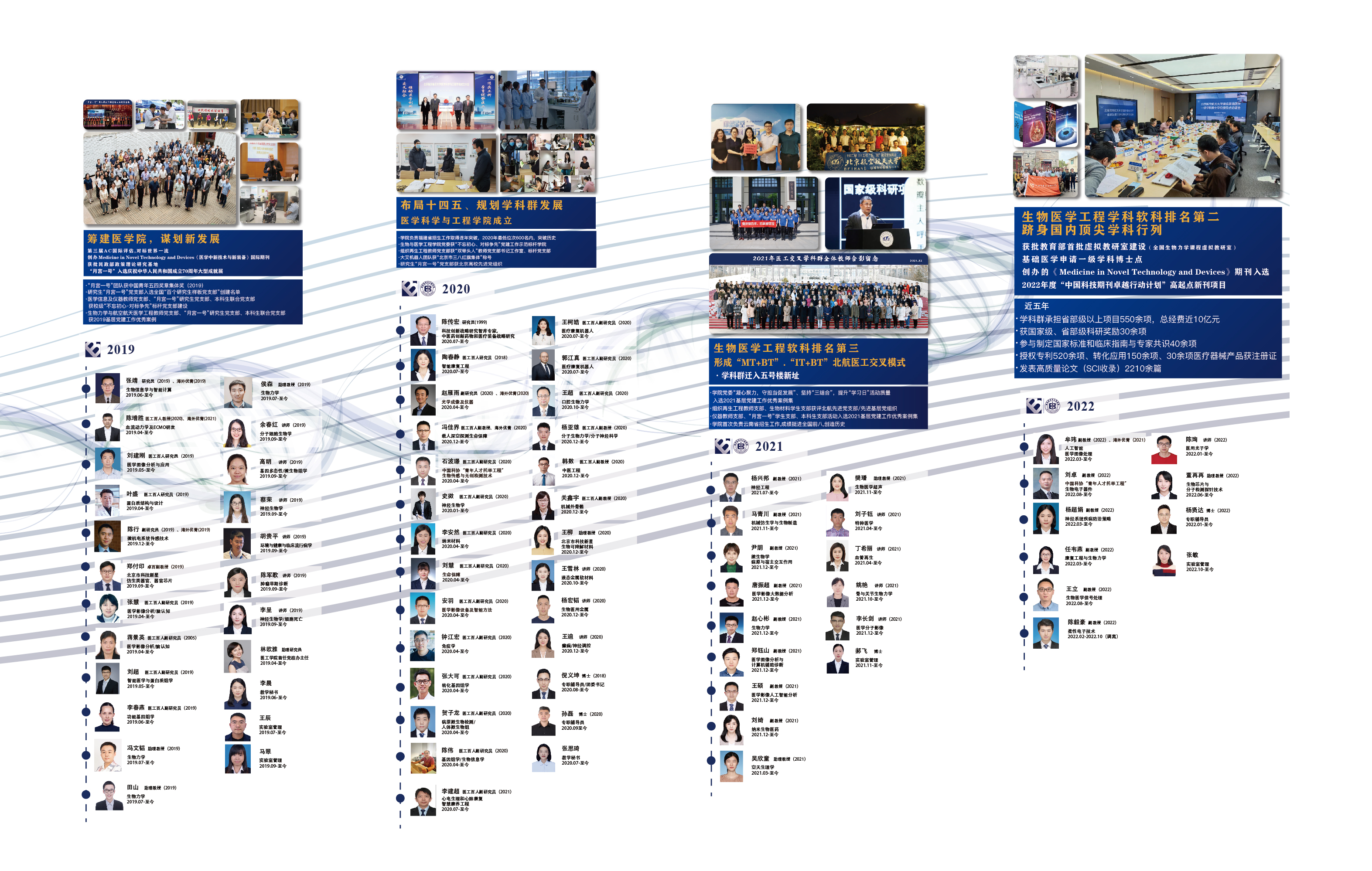 拥有一支结构合理、年轻卓越的高水平医工交叉师资队伍。学科带头人樊瑜波、田捷、刘红等是领域内知名专家。具有专任教师156名,100%具有博士学位,70%具有海外留学经历。学术带头人中包括院士3名、长江学者2名,杰出青年基金获得者3名,国际宇航科学院空间生命学部院士1名;科技部创新团队1个,国家自然科学基金创新群体1个。