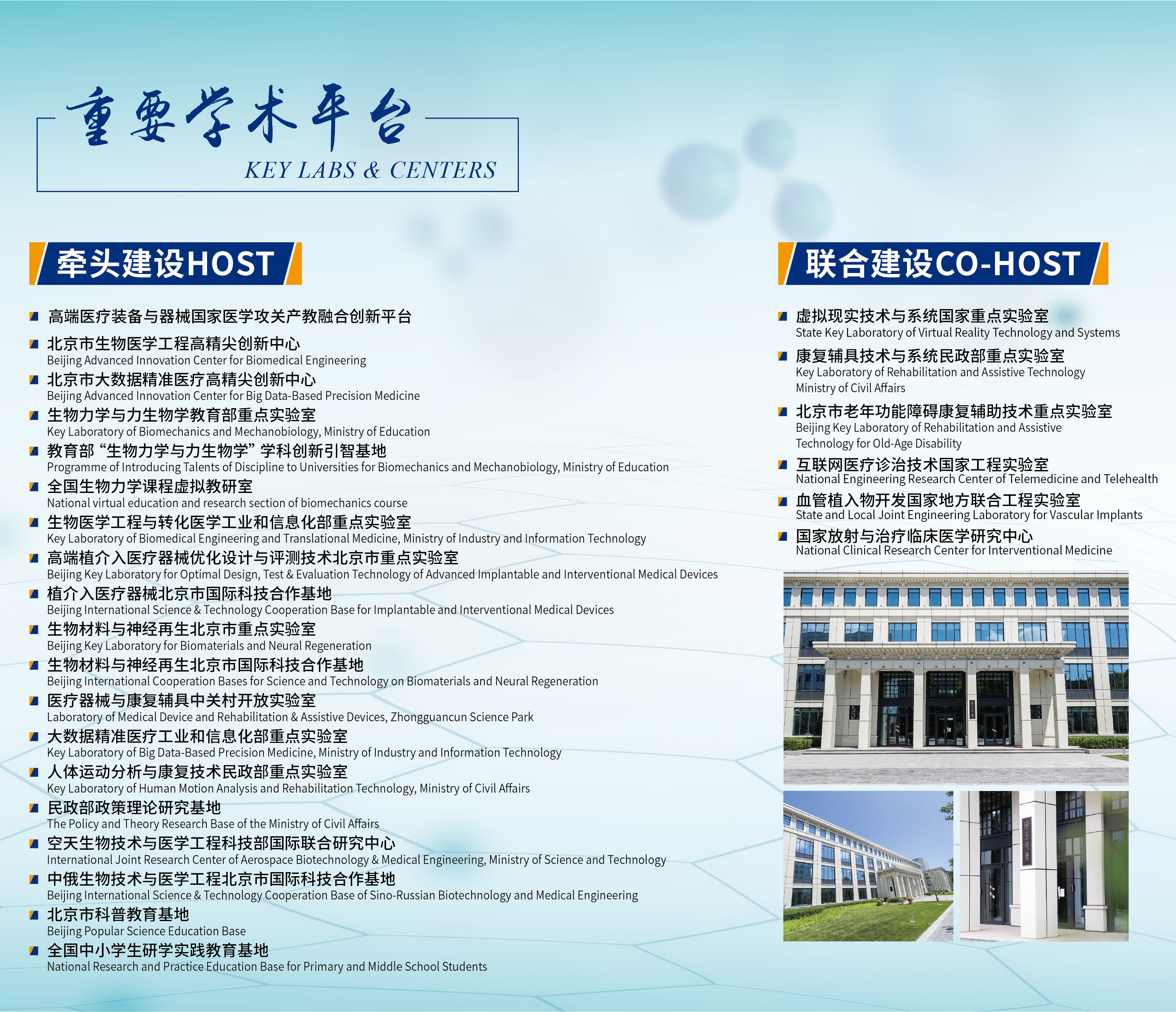 医工交叉学科群依托北航顶尖工科,笃行“医工交叉、两个面向(面向医疗装备与器械、面向航空航天生命保障)”的发展理念,以与人民健康密切相关的世界科技前沿和国家战略需求为导向,深度推进优势工科与生物医学交叉融合,形成了北航医工交叉融合的“MIBT”模式(MT+BT,IT+BT)。2022年“优势医工”建设取得了历史性、标志性突破,生物医学工程学科在第五轮学科评估中进入顶尖学科行列、获批创建高端医疗装备与器械国家医学攻关产教融合创新平台(医工结合方向)。通过高起点规划、高质量建设,经过二十年跨越式发展,北航医工已成为接轨国际、全国顶尖的医工交叉人才培养和科学研究基地,获得了国内外同行的高度认可。