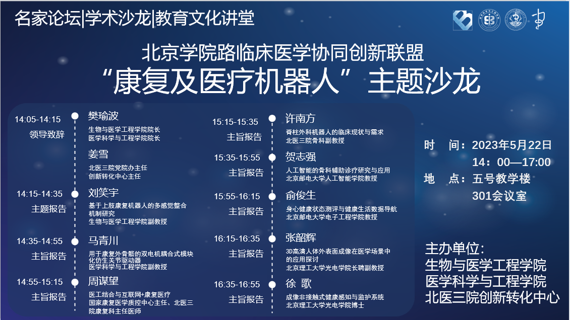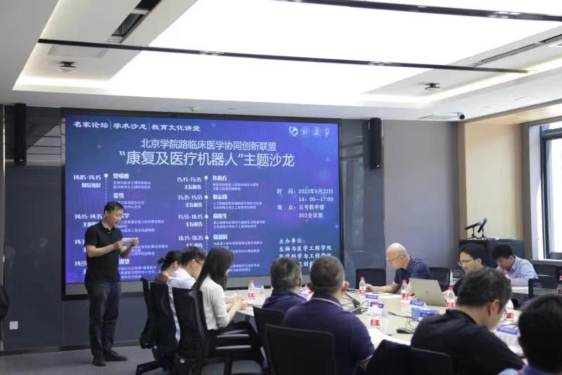5月22日,由北京亚洲成人在线一二三四五六区生物与医学工程学院、医学科学与工程学院以及北医三院创新转化中心联合主办的北京学院路临床医学协同创新联盟“康复及医疗机器人”主题沙龙活动在北京亚洲成人在线一二三四五六区5号楼举办,北航生物与医学工程学院院长、医学科学与工程学院院长、医工交叉创新研究院院长樊瑜波,北京大学第三医院党院办、创新转化中心主任姜雪,国家康复医学质控中心主任、北医三院康复科主任医师周谋望以及来自北医三院、北京亚洲成人在线一二三四五六区、北京理工大学、北京邮电大学的三十余位专家学者共同出席活动,主题沙龙活动由北航生物与医学工程学院副院长姚杰主持。