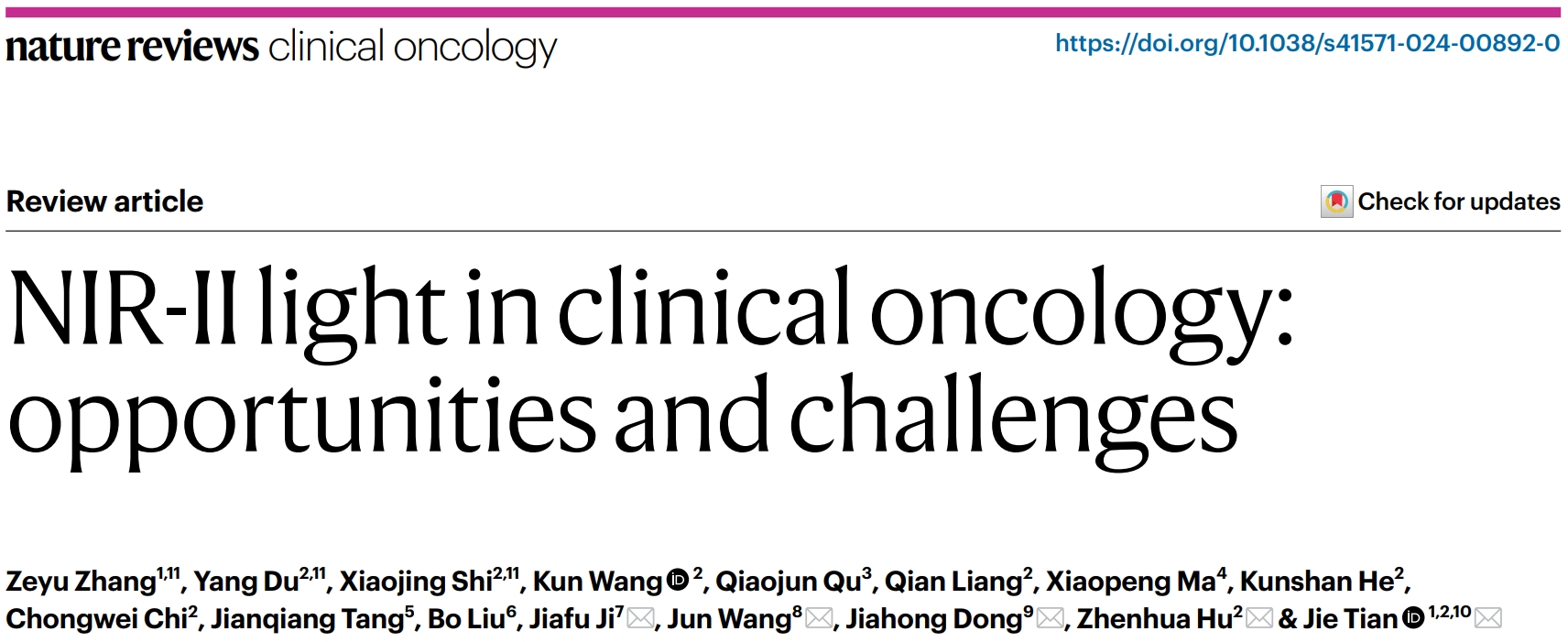 在近红外二区技术亟待临床突破的这一关键时期,北京亚洲成人在线一二三四五六区医学科学与工程学院张泽宇副教授、中国科学院分子影像重点实验室杜洋研究员与史小静助理研究员为共同第一作者;田捷教授、胡振华研究员、清华大学董家鸿教授、北京大学人民医院王俊教授、北京大学北京肿瘤医院季加孚教授作为通讯作者,联合国内多家单位的十余位作者共同撰文,在《Nature Reviews Clinical Oncology》(中科院一区TOP,IF = 78.8)上发表了题目为“NIR-II light in clinical oncology: opportunities and challenges”的综述论文,系统性地回顾了近红外二区技术在临床肿瘤治疗中的代表性进展,并围绕“降低复发率、提高生存率、减少并发症”等方面归纳了新技术带来的典型临床获益,提出了促进新技术成果临床转化的可行策略,为临床肿瘤相关领域的医生、科研人员、工程技术人员等认知近红外二区技术的发展现状和趋势提供了良好的参考。