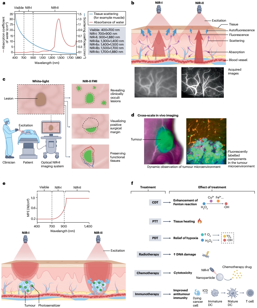 随着肿瘤精准治疗时代的到来,如何在高效杀伤肿瘤细胞的同时充分保护器官组织的功能成为了日益迫切的临床需求。在过去的十余年间,光学分子成像及光学治疗等众多新技术被用于肿瘤诊疗,以增强临床医生对肿瘤的“感知力”、辅助优化治疗决策,达到高灵敏度检出肿瘤、高针对性治疗肿瘤的目标。在这些前沿技术中,近红外二区(波长范围900~1880 nm)成像和治疗技术凭借光散射效应更弱、组织穿透能力更强等特性,在提升肿瘤的治疗精度方面展现出了显著的技术优势,因而备受医学界和学术界的共同关注。