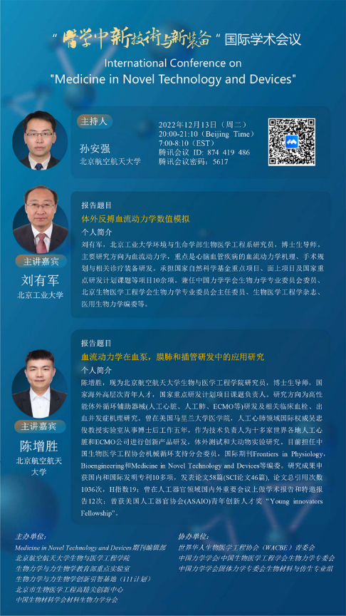 International Conference on “Medicine in Novel Technology and Devices”, 20222022年“医学中新技术与新装备”国际学术会议(入选2022年度中国科协重要学术会议指南) 大会主席:樊瑜波 教授 12月13日线上会场报告时间:2022-12-13,20:00-21:10 (周二) 地点:腾讯会议ID:874-419-486;会议密码:5617报告主题:体外反搏血流动力学数值模拟邀请专家:刘有军 教授 北京工业大学 专家简介:刘有军,北京工业大学环境与生命...